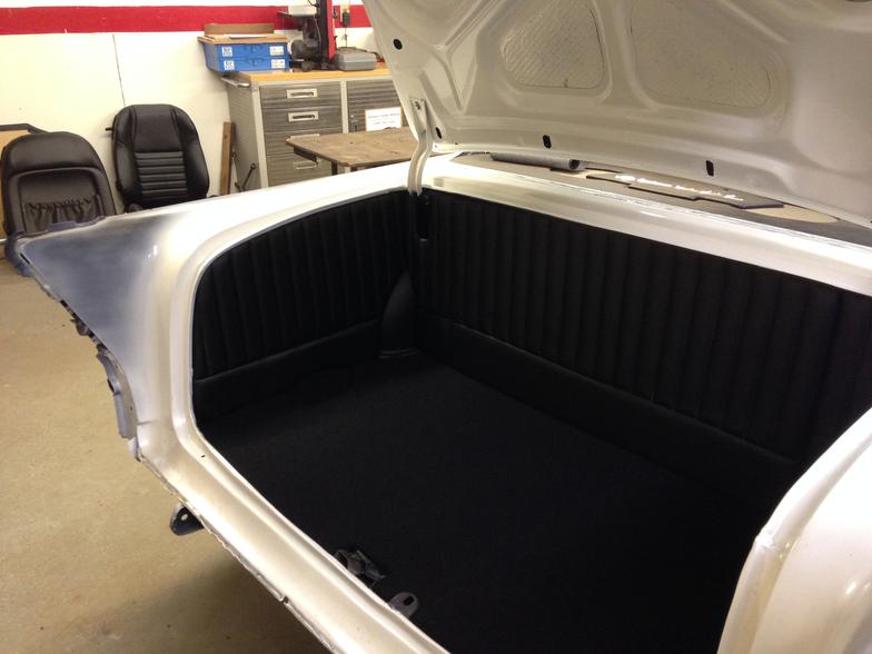 Mild custom black ink Rave simulated leather and light grey Synergy suede. Ford Fusion seats recovered with custom embroidered Viper logos, SRT Hellcat style bolster accents, and red contrast stitching. Smooth suspended board style suede headliner with matching visors. Custom rear wall and raised package tray with integrated glove box. Trunk fully boxed with removable false front wall.